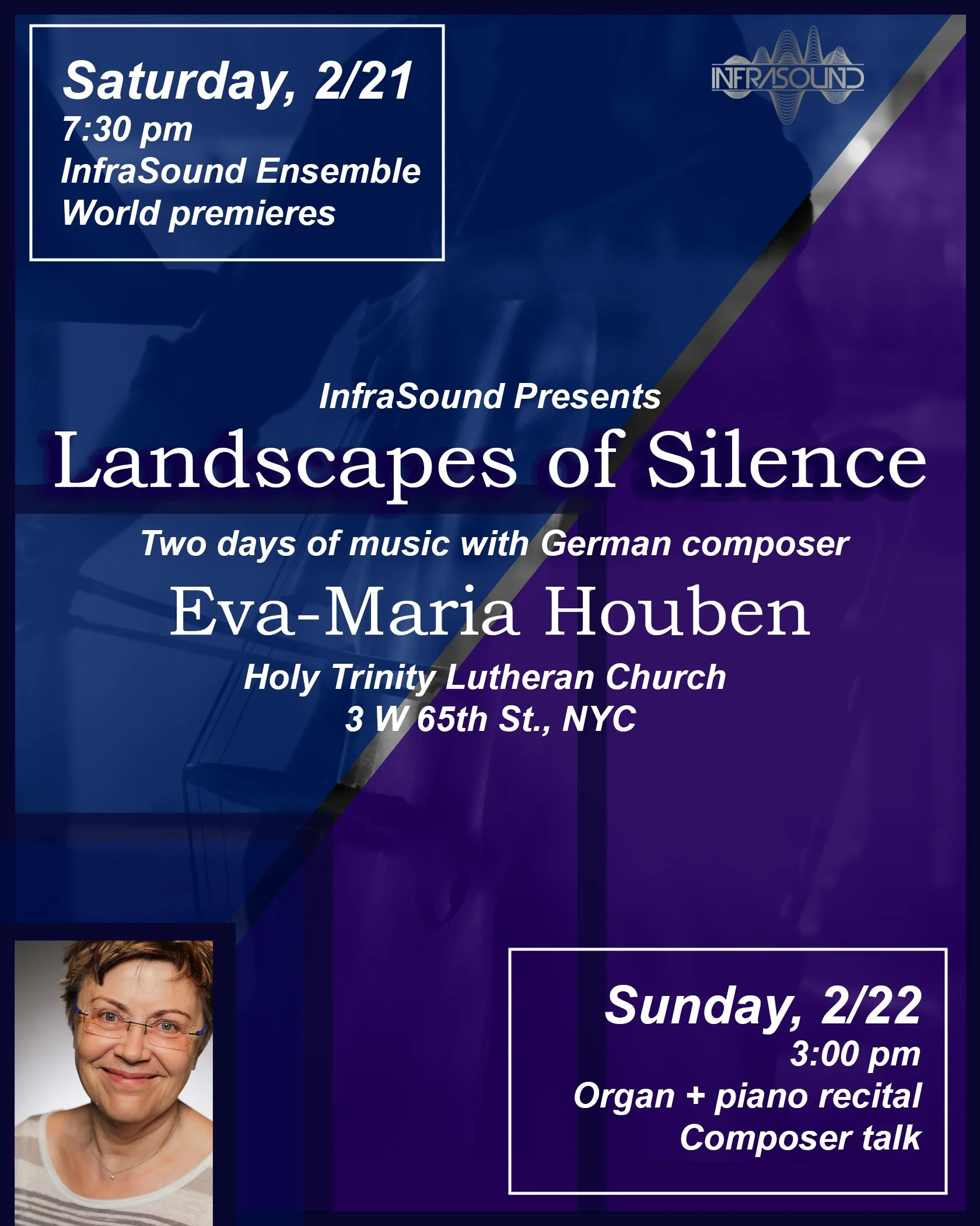 InfraSound presents "Landscapes of Silence," a concert and recital at the boundaries of the perception of sound and silence. Since John Cage's seminal silent work 4'33", composers have explored how silence, breath, and sound can activate a space and how performers and audiences interactions effect the perception of sounds. Featuring world premieres and compositions by Wandelweiser composer Eva-Marie Houben, this meditative concert experience explores the fragility of sound, the "nearly nothing," and the quasi-silent.