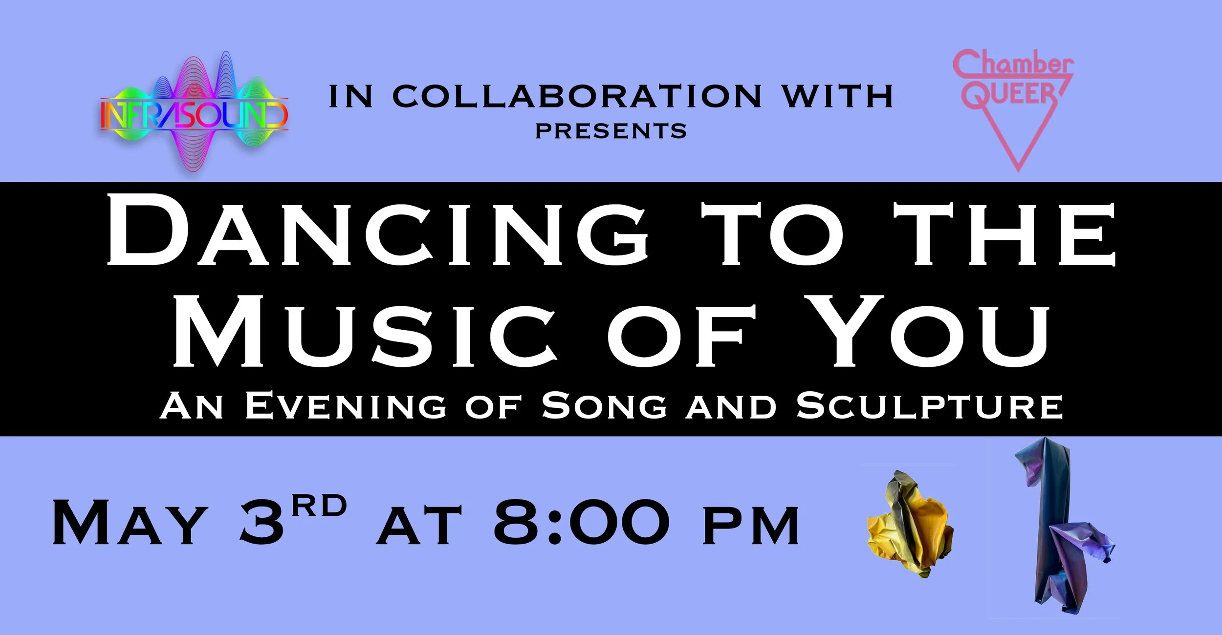 Dancing to the Music of You is a multidisciplinary collaboration between a team of queer NYC-based artists and organizations including InfraSound, ChamberQUEER, sculptor Jeremy Martin, sound designer Alex Gray, and lighting designer Madeline Whitesell. It will be a synthesis of gallery exhibition, sound-art installation, and musical performance taking place on May 3rd, 2024 at The Lesbian, Gay, Bixsexual, and Transgender Community Center (The Center).